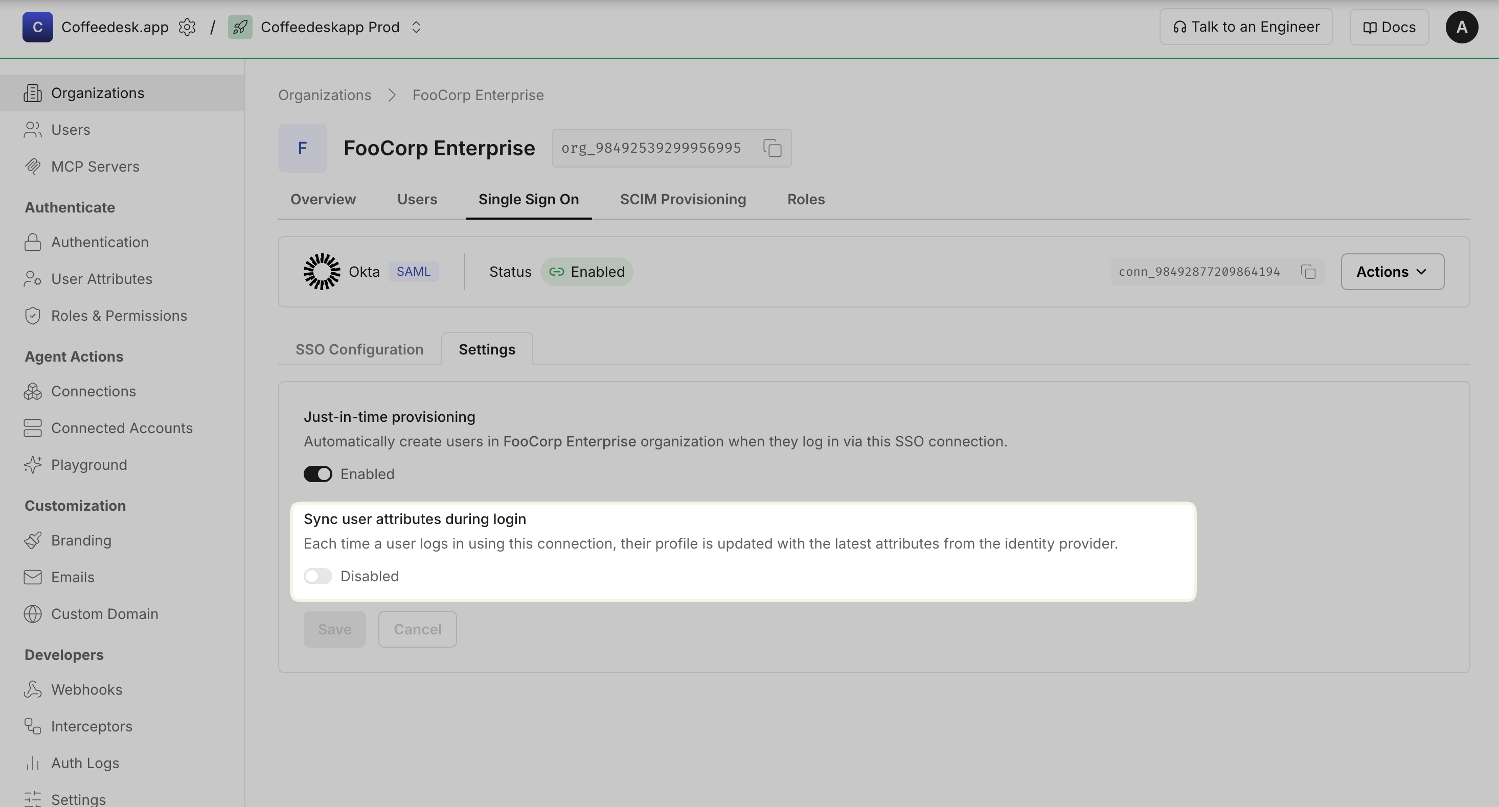 Section titled “Using self-service Admin Portal for organization admins”Your customers (organization admins) can manage JIT provisioning settings through the Admin Portal, including registering organization-owned domains, toggling JIT provisioning on or off, and keeping user profiles in sync with the identity provider.
