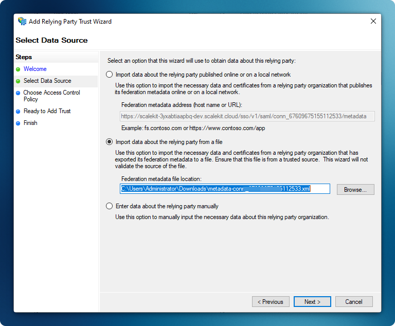 Download Metadata XML file so that you can configure AD FS Server going forward