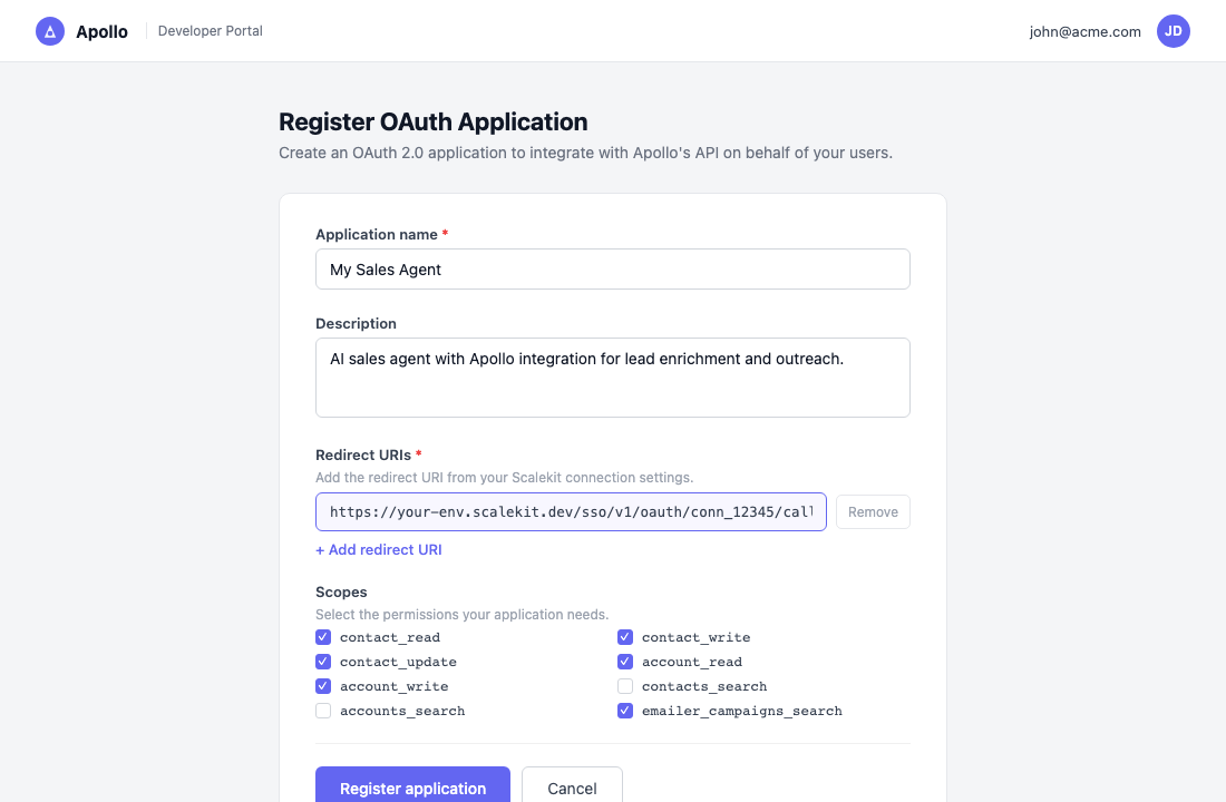 Connect a user’s Apollo account and make API calls on their behalf — Scalekit handles OAuth and token management automatically.