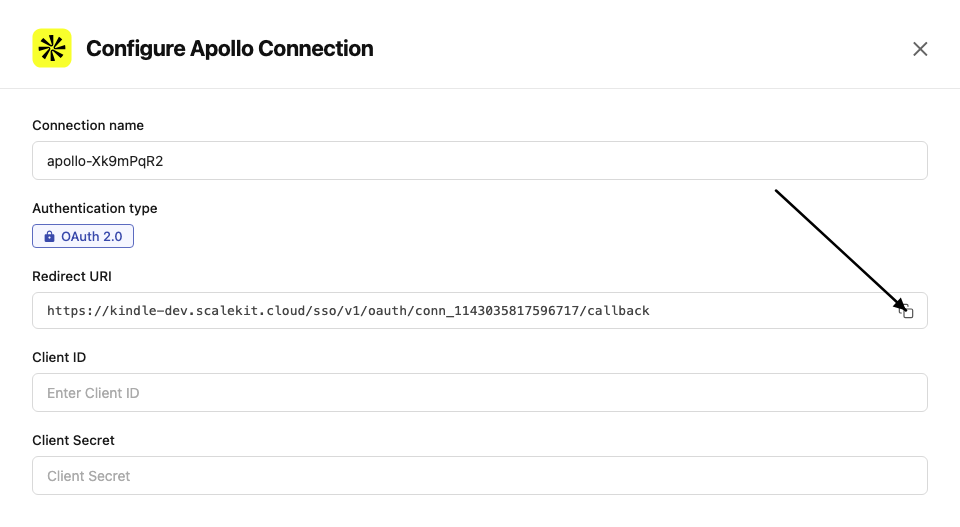 Section titled “Set up the agent connector”Register your Scalekit environment with the Apollo connector so Scalekit handles the authentication flow and token lifecycle for you. The connection name you create will be used to identify and invoke the connection programmatically.