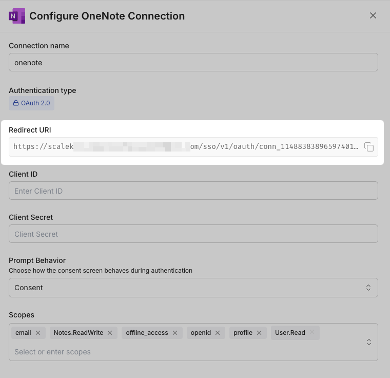 In Scalekit dashboard, go to Agent Auth โ Create Connection. Find OneNote and click Create. Copy the redirect URI. It will look like